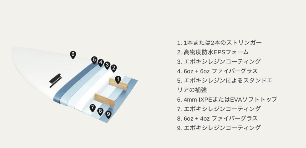 • ビーチアクセス:EPSフォーム(発泡スチロールの硬い核)を中心に、2本の木製ストリンガー(芯材)が入っています。